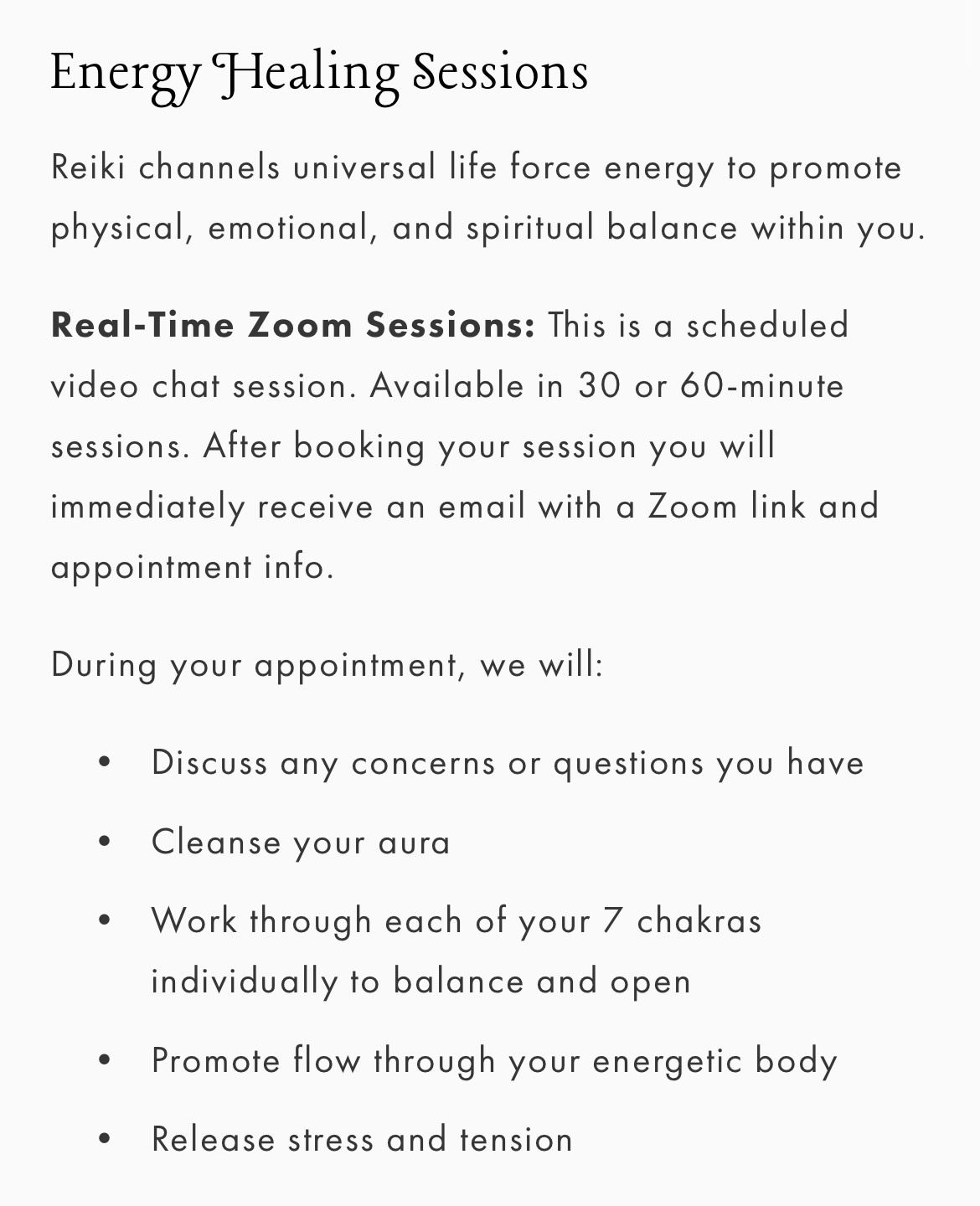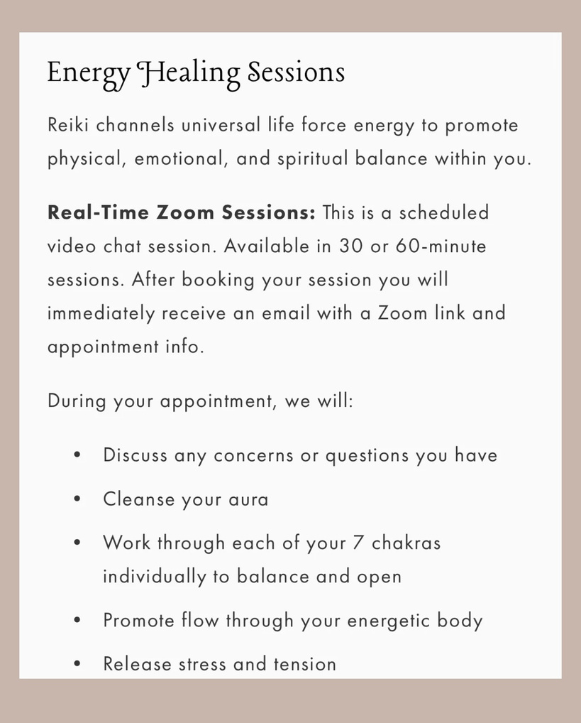 Reiki can be done through video call because we live in a quantum field of energy where we are interconnected. because of this Reiki can also be performed remotely transcending both space and time and is just as affective as an in person experience.